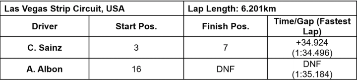James Vowles, Team Principal: Well done to Carlos, P7 was where the car was today pace-wise and he got everything out of it. Clean execution and great to see the gap that we were able to pull to the rest of the midfield. With Alex, a very difficult race for him. The radio failed on the laps to the grid and despite numerous efforts we were not able to reinstate it which meant we had no communication with him. After he got caught up in incidents, we decided the best course of action was to retire the car rather than risk any safety issues. We have got two races to go, a slight build in the points gap for fifth in the Championship and we need to keep doing that.